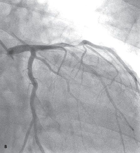 Coronary arteriography revealed single-vessel disease with a 90% stenosis of the proximal left anterior descending (LAD) artery (B). Ejection fraction was 50%. The patient received a drug-eluting stent to the LAD artery lesion and was discharged home the following day in good condition.