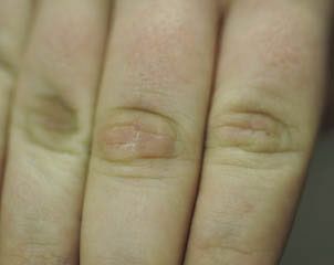Further questioning revealed that the patient had a “nervous,” or compulsive, habit of chewing and biting on his knuckles, E, especially during stressful situations at school.
