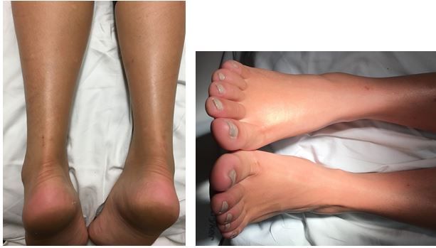 Vital signs and physical examination: Vital signs are normal. Physical examination is normal except for mild warmth, tenderness, and swelling to the ankle and anterior foot. However, she is only tender in the Achilles area, which barely appears swollen in comparison to the foot. (See image above; right side is the symptomatic side; click once on image to enlarge).