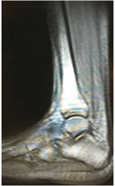 It was decided to get an urgent MRI, which confirmed inflammatory changes of the lower Achilles tendon (see image at right; click image once to enlarge). There was no cellulitis or joint effusion. Patient had recently taken a quinolone for a UTI.