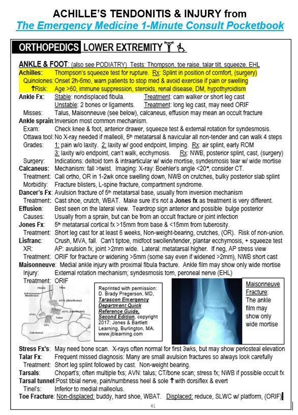 Discussion: Achilles rupture may occur without warning, usually during strenuous activity, or may occur after a prodrome of discomfort likely related to tendonitis/tendonopathy. Symptoms of rupture include sudden pain followed by inability to walk. Examination will show an Achilles defect and an abnormal Thompson test (AKA calf squeeze test).