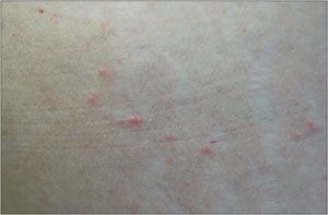 Dips (amitraz), pour-on miticides (alcohol-based ivermectin), and oral products (milbemycin) are effective treatments for sarcoptic mange in animals. This patient’s dog and house were treated, and her rash gradually resolved over a 2-week period without the formation of new lesions. Because she had intense pruritus, she was treated with prednisone in a tapering dosage, ivermectin, and topical precipitated sulfur in triamcinolone cream.
