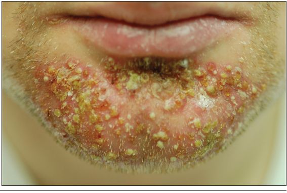 This patient had staphylococcal impetigo, B, that was spread by shaving. He was treated with intranasal mupirocin for the presumed nasal carrier state and was also given an oral antibiotic to cover for methicillin-resistant Staphylococcus aureus. The rash resolved uneventfully.