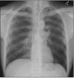 This chest radiographshows a bilateral reticulonodularpattern with upper zonepredominance and bilateral hilarpredominance.