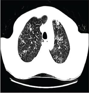 This CT scan ofthe chest shows multipleclusters of micronodularopacities in bilateral upperlobes and bronchiectasisand traction in the leftupper lobe.