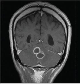 This MRI scan ofthe head, taken on admission,shows 2 predominant ringenhancinglesions withsurrounding vasogenicedema.