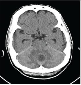 This CT scan of thehead, taken on admission,shows a cerebellar vermianmass with associatedvasogenic edema andmoderate cerebral atrophy.