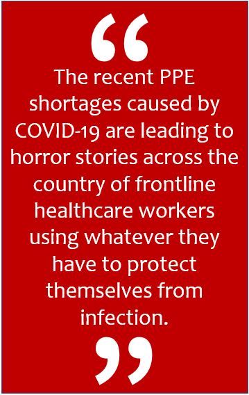 The recent PPE shortages caused by COVID-19 are leading to horror stories across the country of frontline healthcare workers using whatever they have to protect themselves from infection. I recently read a piece describing an ER physician who had been using his ski goggles as eye protection because the hospitals he covered had nothing else for him to use.