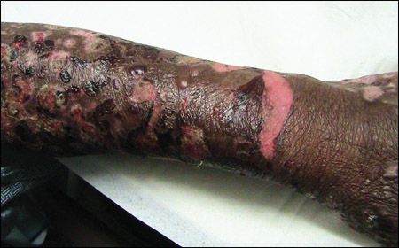 In addition to furosemide, captopril, phenytoin, and ciprofloxacin have also been implicated in drug-induced pemphigoid. Antibodies against hemidesmosomal antigens BP230 and BP180 can be found. Treatment includes discontinuation of the offending medication and topical corticosteroids. This patient's lesions began to resolve after she discontinued her medication and started treatment with oral methylprednisolone and topical triamcinolone.