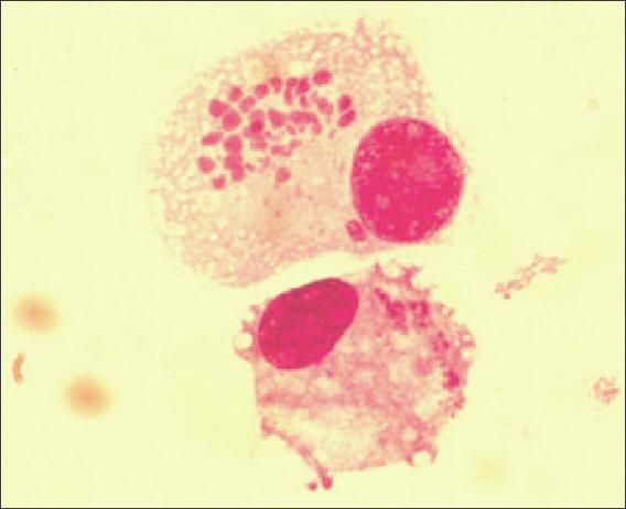 This image shows a canine macrophage with intracytoplasmic aggregations (morulae).(Photo courtesy of Andrea Varela-Stokes, DVM, PhD, Mississippi State University; usedwith permission.)