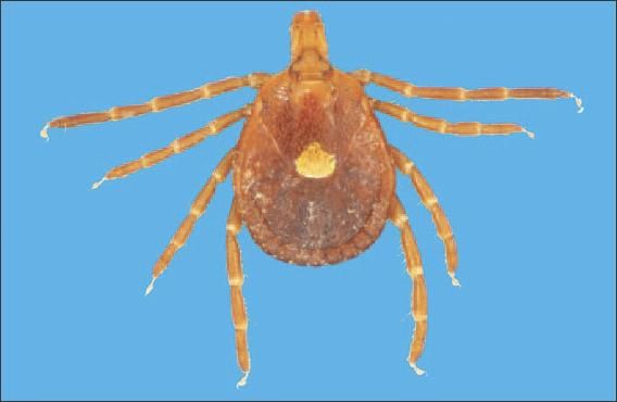 Pictured is an adult female Lone Star tick Amblyomma americanum. (Photocourtesy of Blake Layton, PhD, Mississippi State University Extension Service; used withpermission.)