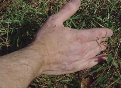 The southernUnited States is ahotbed for Lone Starticks. Dozens ofnymphal Lone Starticks are shown on theauthor's hand. (Photocopyright 2002 byJerome Goddard, PhD.)