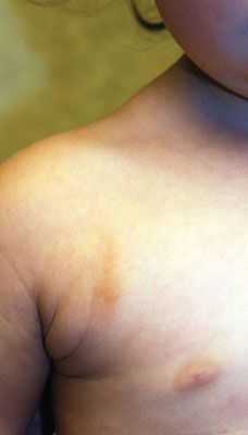 The lightly pigmented papule on this patient’s shoulder is characteristic of a solitary mastocytoma, D. This benign proliferation of mast cells usually appears during infancy and resolves before puberty. The release of histamine on stroking causes an urticarial reaction that can sometimes produce a blister. The use of a potent topical corticosteroid cream for a few weeks is usually sufficient to control the urticarial symptoms. A solitary mastocytoma typically is not associated with systemic symptoms, which may accompany widespread lesions. These symptoms can include flushing, headache, dyspnea, wheezing, rhinorrhea, nausea, vomiting, diarrhea, and syncope.