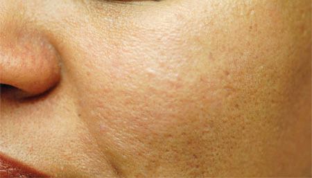 Skin lesions of sarcoidosis are more inflamed and more papular than this patient’s rash. Cutaneous lupus erythematosus is either inflammatory or features pigmentary changes depending on the type of lupus. Polymorphous light eruption usually manifests with erythematous patches and papules that are often pruritic. The onset of acne would be unusual at age 39 without other precipitating factors.