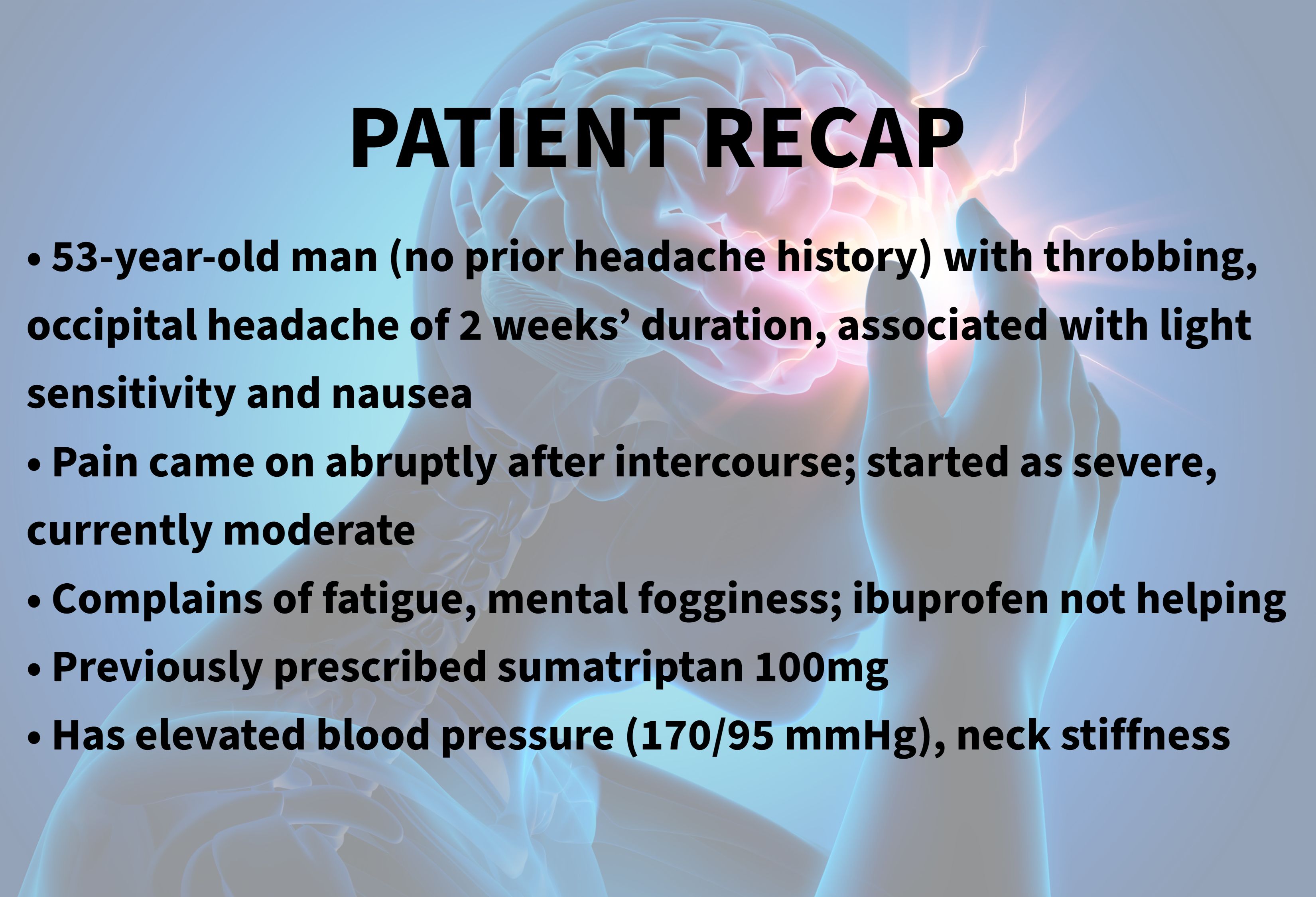 Your patient comes up positive for 2 Os (abrupt onset, and age >50 years), as well as S for systemic (fatigue, elevated blood pressure, mental fogginess) and N (neck stiffness). He even qualifies for the last P (precipitated by exercise – or in this case intercourse).