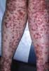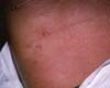 Maculopapular eruptions appear more measles-like than this eruption. The lesions of pityriasis rosea are oval-shaped and macular and are usually confined to the trunk and proximal extremities. Psoriasis has more scale. Scabies manifests as inflammatory papules in the finger webs and on the genitalia.