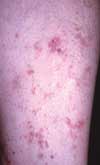 For several months, a 47-year-old man has been bothered by a pruritic eruption on his arms, legs, and trunk. Several months before the outbreak, he had started taking a combination antihypertensive drug that contained a calcium channel blocker and an angiotensin-converting enzyme (ACE) inhibitor.