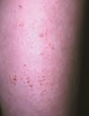 For several weeks, an 11-year-old girl has had itchy shins. She plays soccer and wears shin guards. Although she bathes frequently, she has not used any new soaps. The family has a dog, and there is a family history of asthma.