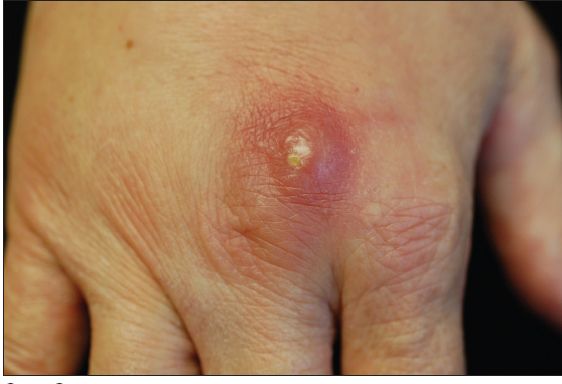 A 63-year-old woman presents with a tender nodule of 10 days’ duration on the dorsum of her right hand. She does not remember any specific injury, but she does do her own housework. Another physician prescribed doxycycline, 100 mg bid; however, the nodule has persisted. You order a bacterial culture.