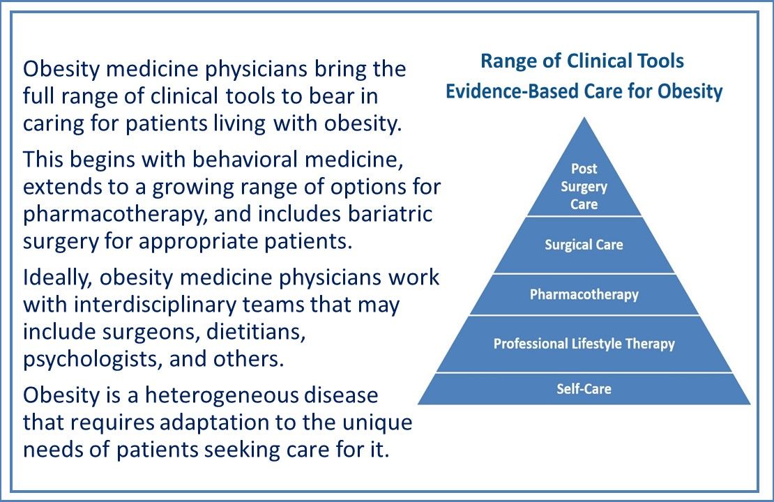 Obesity Medicine physicians have the training to treat obesity and deal with the unique physiology of this disease. Specialists in the field also have expertise in behavioral medicine and the psychosocial aspects of obesity. As much or more than in any other chronic disease, a patient-centered approach to obesity care is critical. (See Figure below, Evidence-based Care for Obesity)