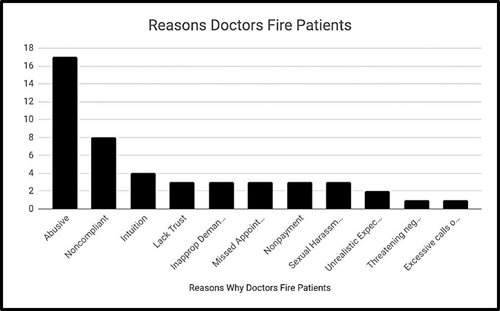 The reasons cited after abuse, noncompliance, and intuition were all lower in number and included: verbalized lack of trust in the physician, demand for inappropriate treatment, missed appointments, and sexual harassment. The least common reasons were: unrealistic expectations, threatening negative social media reviews, and excessive phone calls or emails.