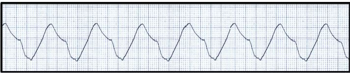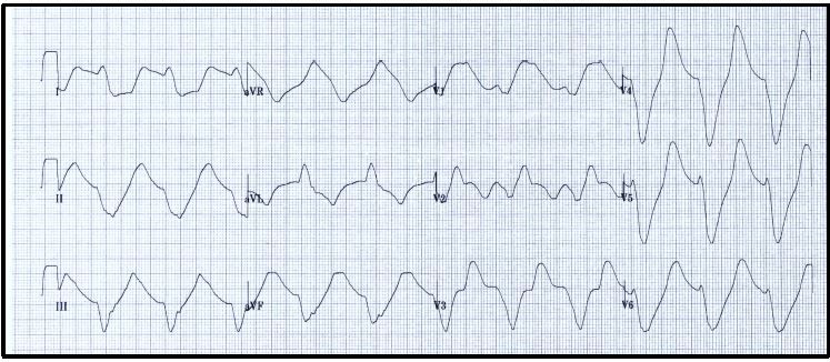 On examination, she was confused and lethargic but was aroused by stimuli and spoke coherently. Vital signs were: blood pressure, 188/106 mmHg; pulse, approximately 70 beats/min; respiratory rate, 24 breaths/min; temperature, 36.1°C (97°F); and oxygen saturation, 94% on room air; the ECG monitor demonstrated the rhythm strip in Figure 1. A bedside glucose was 256 mg/dL. The remainder of the examination was unremarkable. Results of a 12-lead ECG are seen in Figure 2.