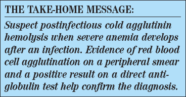 Outcome of this case. The patient had postinfectious cold agglutinin hemolysis. Azithromycin was started. After transfusion of 4 units of packed red blood cells and several days of antibiotic therapy, the hemolytic process began to subside. Subsequently, serology for Mycoplasma was positive. Her hemolysis continued to abate over the next week, and after 3 weeks she was fully recovered.