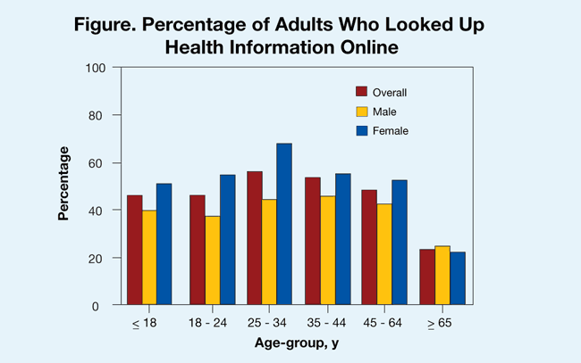 Women are more likely to look for health information online, according to results of the 2009 National Health Interview Survey.1 Of all those who responded, 45.6% said they had looked up health information on the Internet within the past year. Those aged 25 to 34 years were most likely to seek information online, and those 65 and older were least likely.