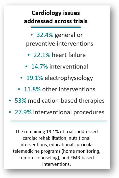 Among trials that reported racial demographics, investigators reported on average 72.9% of participants were White. Overall mean participant age was 65.1 years, according to the findings. (See Figure, right, for cardiology issues addressed across trials).