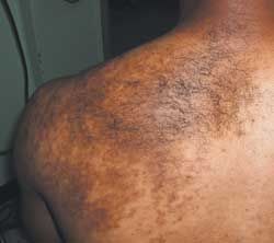 A 24-year-old man is concerned about a large, hairy "mole" on his left shoulder. The lesion appeared during adolescence as a group of small, dark blotches. These eventually coalesced into a hyperpigmented patch with hair and acne.