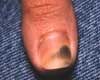 Trauma that causes separation between the nail plate and nail bed and renders the nail more susceptible to infectionis thought to be the usual cause, although this patient could not recall an injury.