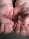 For more than 5 years, a 45-year-old woman has had intermittent painful erythematous and violaceous papules on her arms and legs. In addition, she has experienced complete or partial loss of fingernails. She is otherwise healthy, has no significant medical history, and is not taking any medications.