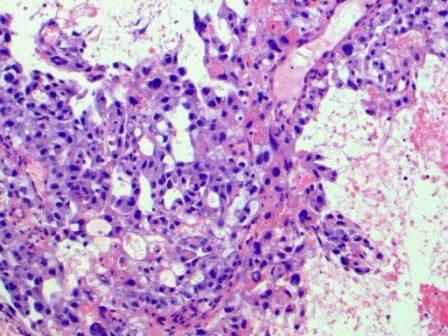 Figure 4. H&E, vacuolated cytoplasm with intracytoplasmic eosinophilic granules and pleomorphic tumor cells.