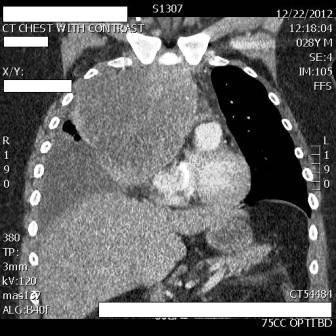 The patient had initially received a diagnosis of acute bronchitis and was treated with a 5-day course of azithromycin, codeine, and prednisone. He was referred to a pulmonologist after his symptoms persisted; x-ray films showed infiltrates. Chest CT revealed an anterior mediastinal mass associated with lymphadenopathy.