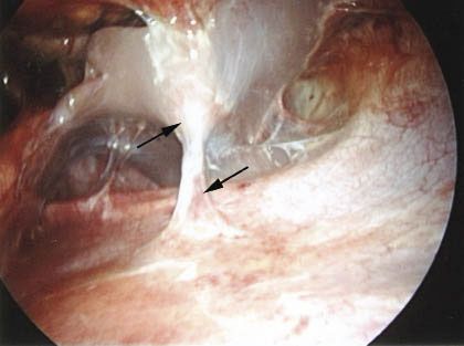 Figure – Extensive perihepatic adhesions (arrows) of Fitz-Hugh-Curtis syndrome are visible between the liver (inferiorly) and the peritoneal cavity and diaphragm (superior and left).