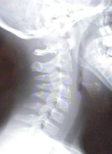 Radiographs of this patient demonstrate widening of the prevertebral soft tissues: this finding is consistent with a retropharyngeal abscess (see Figure 1). Although at first glance the soft tissues may appear normal, there should actually be a step-off around C3-C4, which is not noted in this film. Normal prevertebral soft tissues should measure less than 6 mm at C2 and less than 22 mm at C6. A normal x-ray film is provided for comparison (Figure 2).