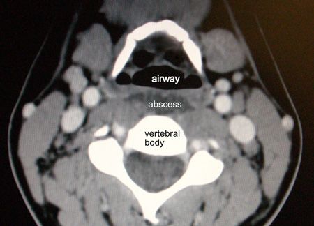 Diagnosis. A lateral neck x-ray film is 85% to 90% sensitive for retropharyngeal abscess. CT scanning is more sensitive, especially in children, where x-ray films can be falsely positive, and can help determine whether surgery is necessary and, if so, by what approach. CT does, however, expose the patient to high radiation dosage and may be avoided in milder cases that respond clinically to medical therapy, especially in younger patients in whom risks of radiation are higher. In this patient, CT images note the dark fluid collection anterior to the vertebral body.